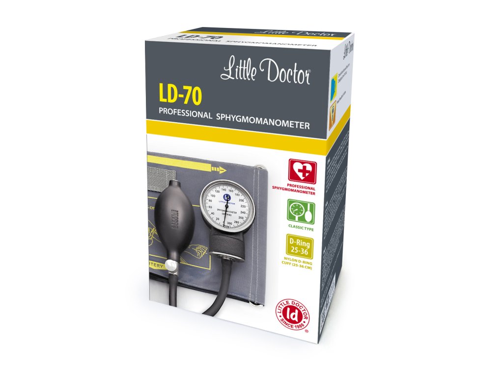 Aneroidní tlakoměr LD-70 je spolehlivé zdravotnické zařízení určené k manuálnímu měření krevního tlaku. Je vybaven kovovým aneroidním manometrem o průměru 45 mm, který zajišťuje dobrou čitelnost a dlouhou životnost přístroje. Rozsah měření je 0–300 mmHg s přesností ±3 mmHg.