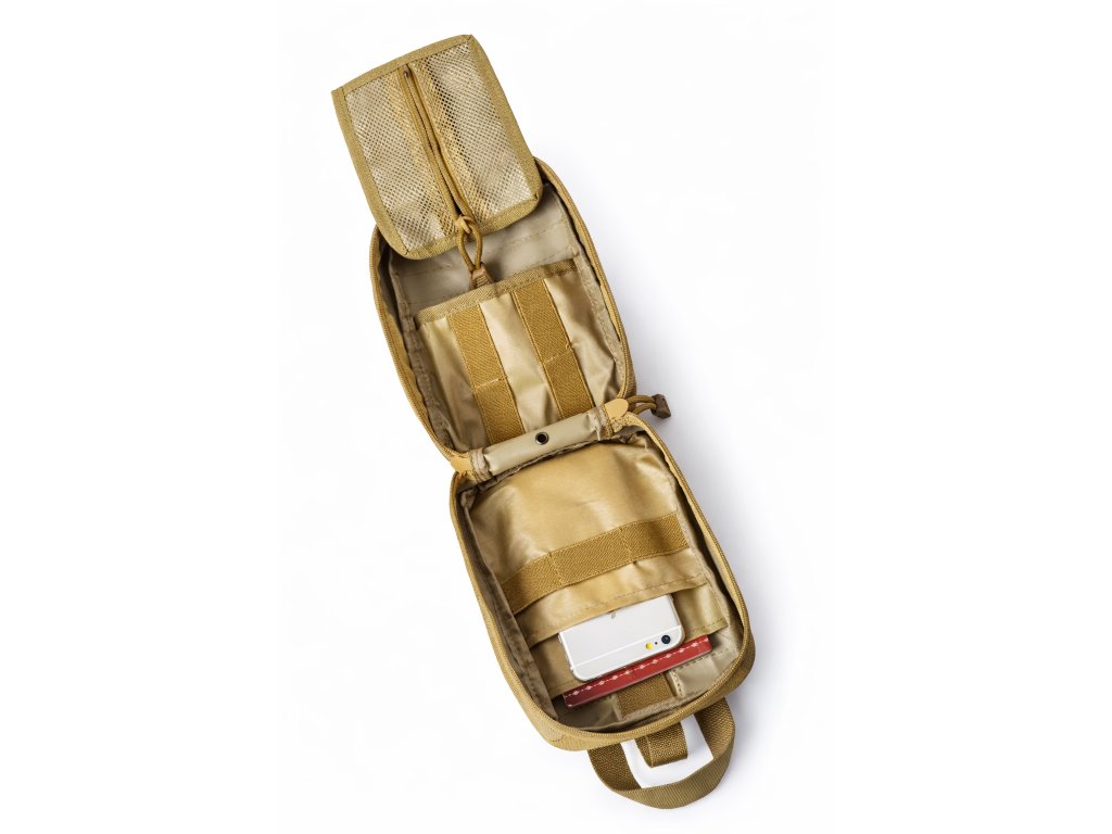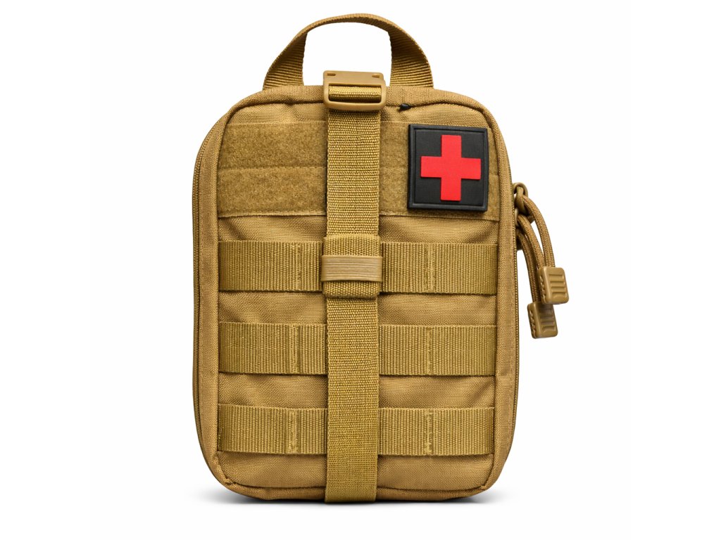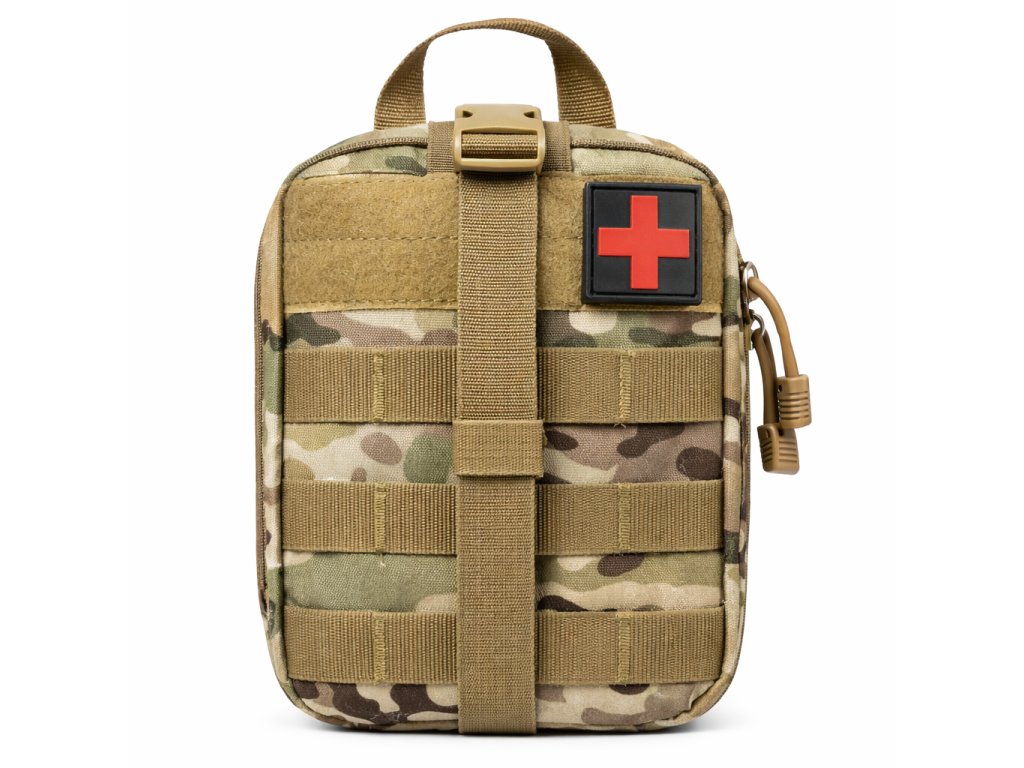Taktické pouzdro na výbavu první pomoci (IFAK – Individual First Aid Kit) určené pro každodenní nošení, střelnici, turistiku i jako auto-lékárnička. Voděodolný nylon chrání obsah před deštěm a nečistotami, zatímco zadní MOLLE systém umožňuje připevnění na batoh nebo vestu. Díky průvleku na opasek lze pouzdro nosit i samostatně.