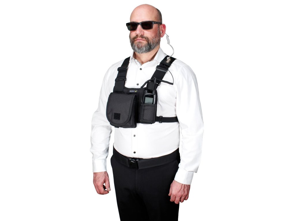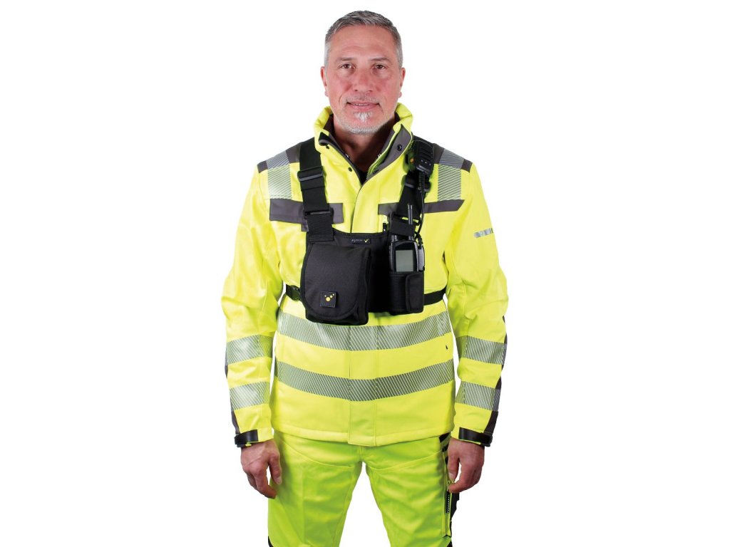 Přihrádka na rádio, umístěná na levé straně, je nastavitelná na velikost vysílačky nebo jiného zařízení jako je otočná svítilna apod. Textilní poutko pro upevnění antény podporuje pevné držení rádia.