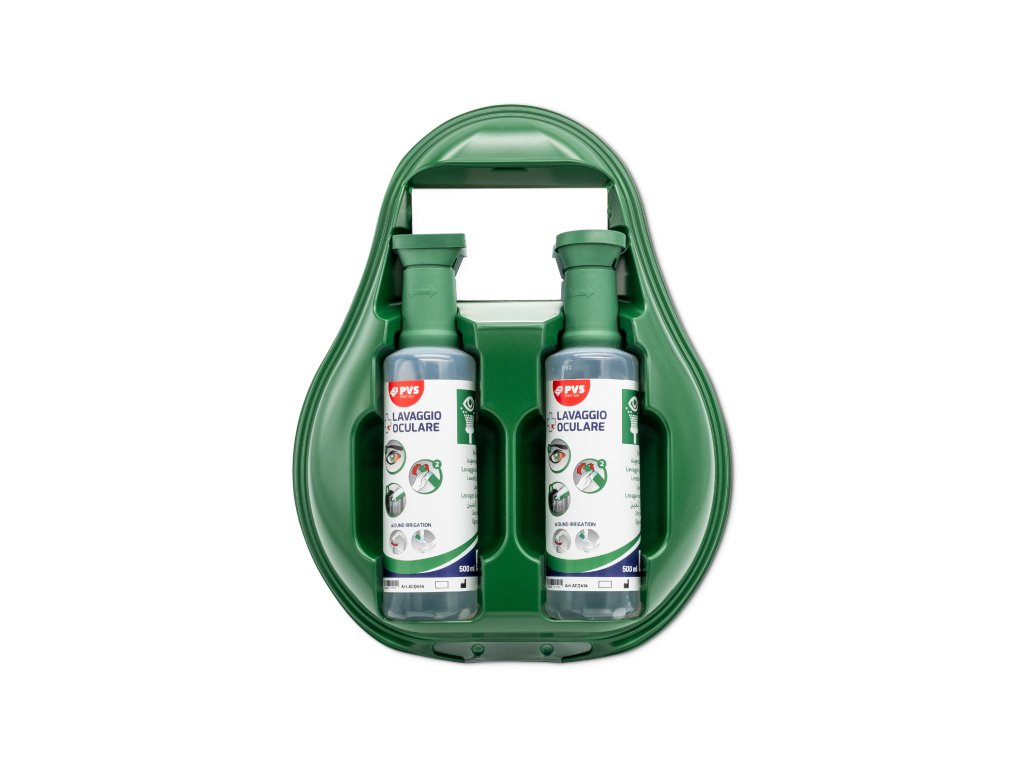 Držák je vyroben z tepelně vytvarovaného plastu s transparentním víkem. Držák je možné snadno připevnit na zeď pomocí šroubů s hmoždinkami (jsou součástí dodávky). Plastový držák chrání láhve na výplach očí před znečištěním. Držák obsahuje 2x láhev s fyziologickým roztokem (sterilní 0,9% NaCl) o objemu 500 ml a zrcátko. Určeno pro pohotovou první pomoc při zasažení očí nečistotami a chemickými látkami. Lahve vybaveny ergonomicky tvarovanou oční misku pro otevření očního víčka – výplachová kapalina tak získá přístup. Jedna 500 ml lahev vystačí na cca 4 minuty intenzivního vyplachování.